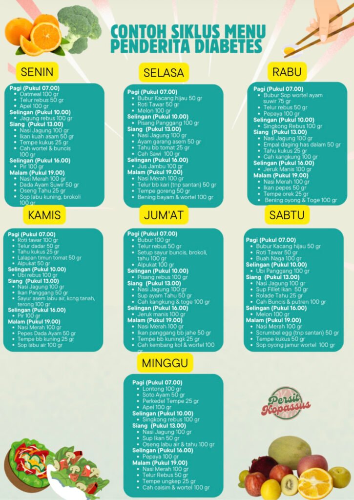 Pola makan sehat berperan penting dalam mencegah dan mengendalikan diabetes melitus. Diet DM bukan hanya tentang membatasi gula, tetapi juga menjaga keseimbangan gizi dan pola makan teratur. Dengan menerapkan prinsip “3J” serta aktivitas fisik rutin, risiko diabetes dan komplikasinya dapat ditekan secara signifikan.