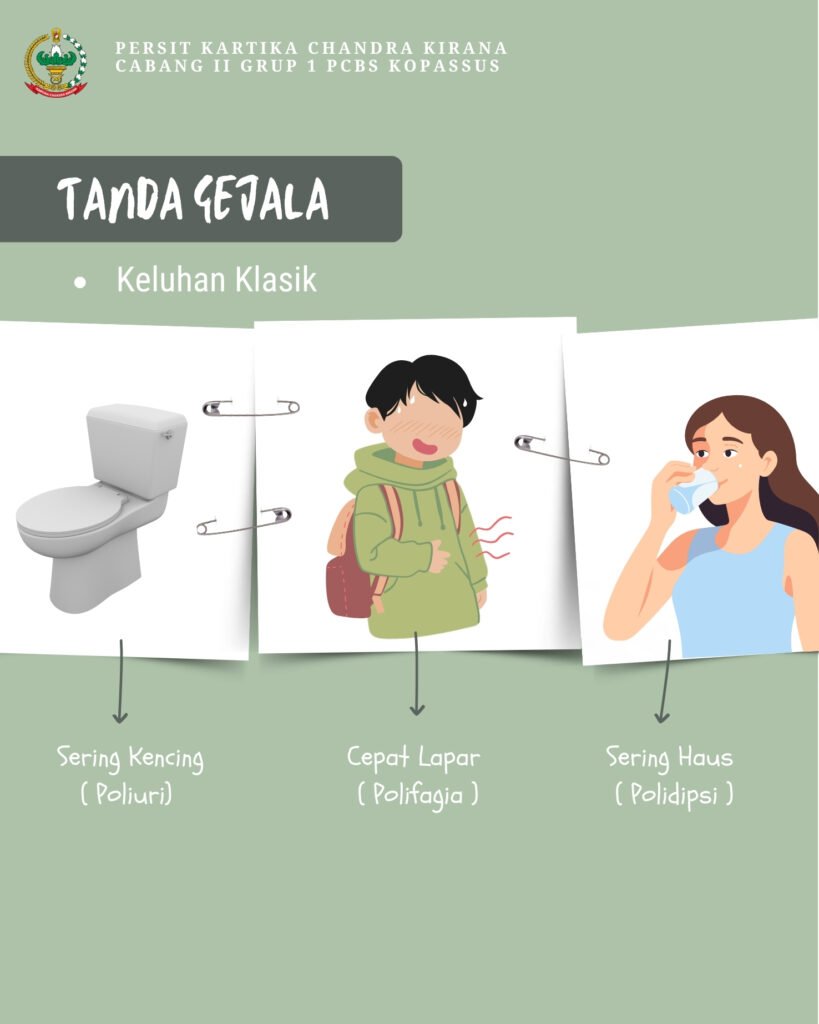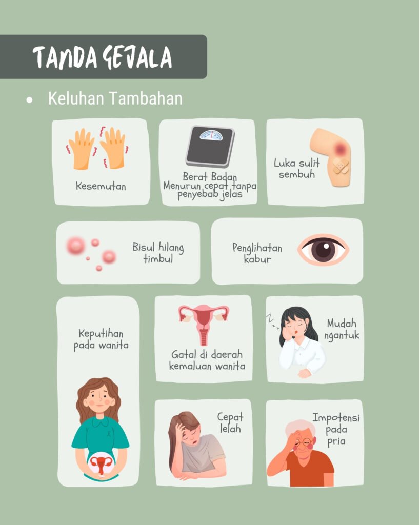 Tanda dan gejala DM, sebagai berikut : cepat merasa haus, sering buang air kecil, merasa lapar terus menerus, kadar gula darah tinggi, penurunan BB yang tidak tahu penyebabnya, Rasa lelah yang terus menerus, penyembuhan luka lambat. Keluhan lainnya : kesemutan, gatal – gatal, mata kabur, keputihan pada wanita, gangguan ereksi pada pria, bisul hilang timbul dan mudah mengantuk.